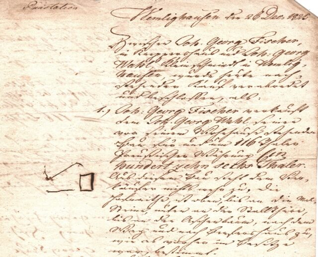 Wemlighausen den 26 Dec: 1825 Zwischen Joh. Georg Fischer in Kneppershaus und Joh: Georg Wahl, Kleinschmiet in Wemlighausen, wurde heute nachstehender Kauf verabredet: 1) Joh: Georg Fischer verkauft dem Joh. Georg Wahl seinen vor seinem Wohnhause stehenden Bau für 116 Thaler Preußischer Währung. Dieser Bau wird zu einem Wohnhause verkauft und am Maytag 1826 übergeben. 2) Zahlungstermine: heute: 7 Thlr 10. Februar: 65 Thlr Maytag 1826: Rest 44 Thlr Unterschriften: Joh. Georg Fischer Joh. Georg Wahl zenschmit Johann Philipp Müsse Bezeugt: C. Wetzel